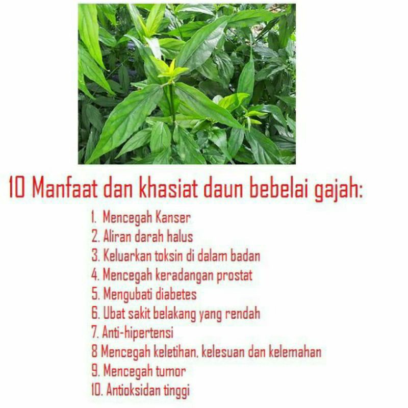 . Adapun khasiat daun belalai gajah untuk kencing manis hingga kanker diantaranya adalah sebagai berikut. Tanaman ini juga dipercaya memiliki khasiat antikanker sehingga berpotensi mencegah dan mengobati kanker. Hal ini terkait dengan sifat antioksidan yang menyehatkan sel-sel tubuh Anda.